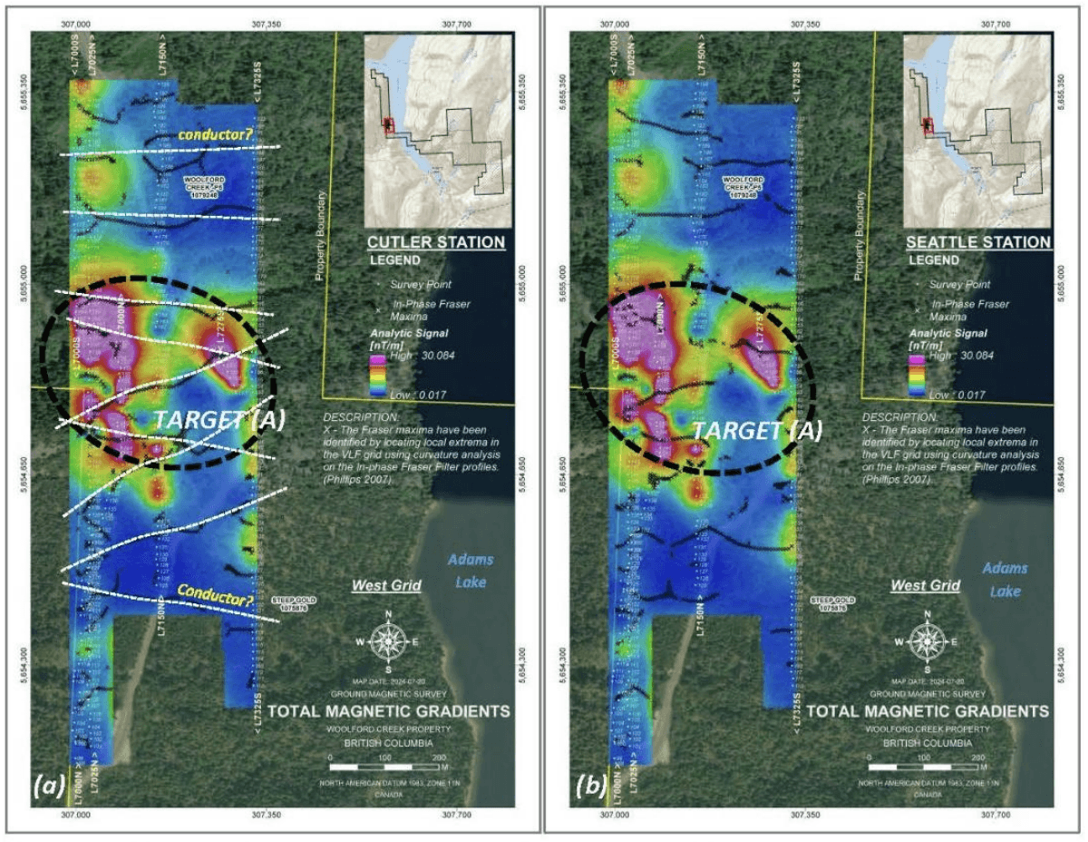 Geophysical surveys identified two significant targets: Target (A) on the West Grid with high magnetic gradients and EM conductivity, and Target (B) on the East Grid interpreted as a sulphide-bearing lithological contact (see Figures below).